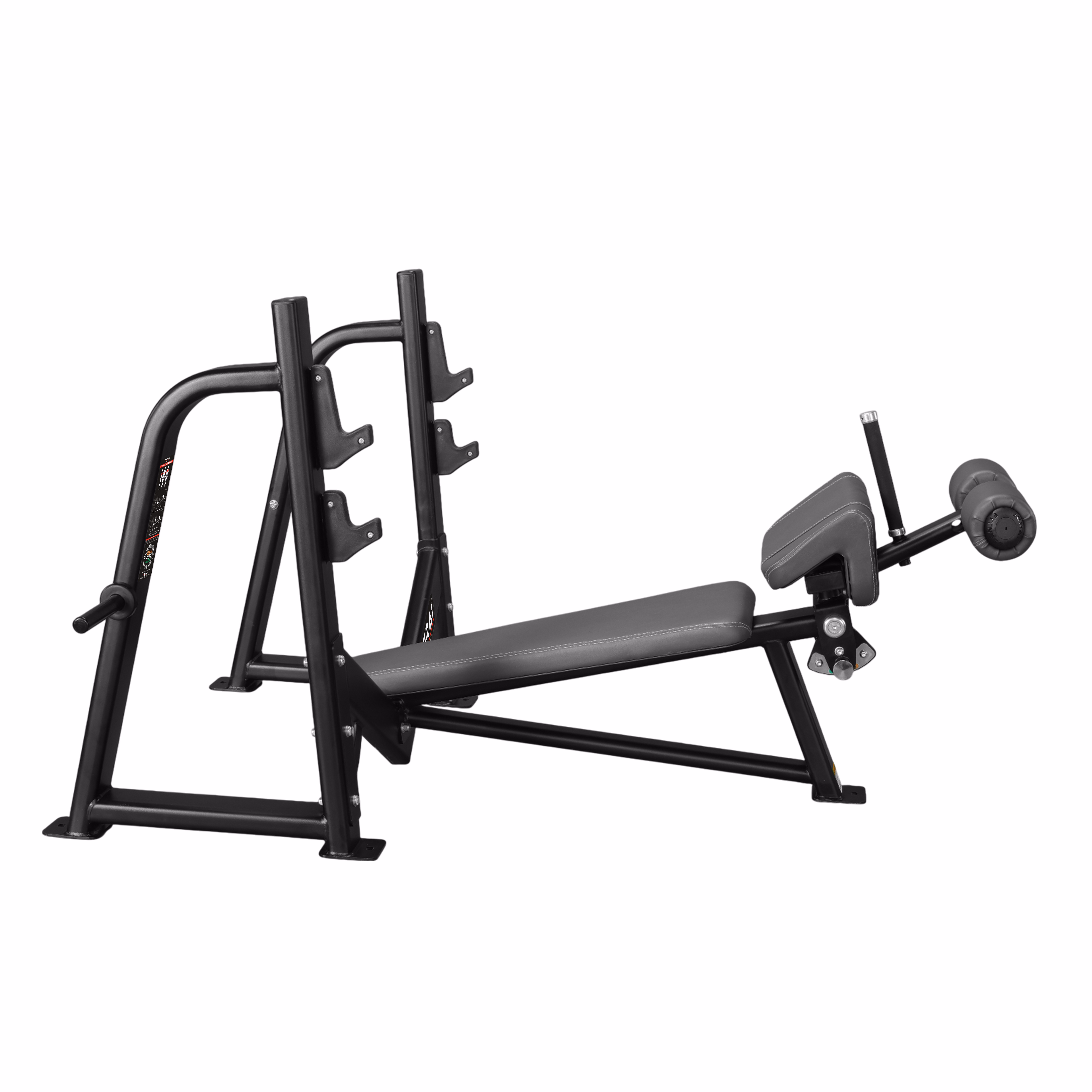 The Olympic Decline Bench from the proton series is designed to focus on lower chest engagement with strong support and safety. Purpose-built for targeting the lower pectoral muscles, the Olympic Decline Bench ensures a secure and powerful decline pressing experience. Equipped with a contoured back pad, adjustable leg rollers for lockdown support, and an angled frame, it promotes proper body alignment and lifting posture. The integrated bar catchers support Olympic barbells, while rear weight horns offer convenient plate storage. Engineered for stability, safety, and performance—this bench is a staple for serious strength zones in commercial gyms.