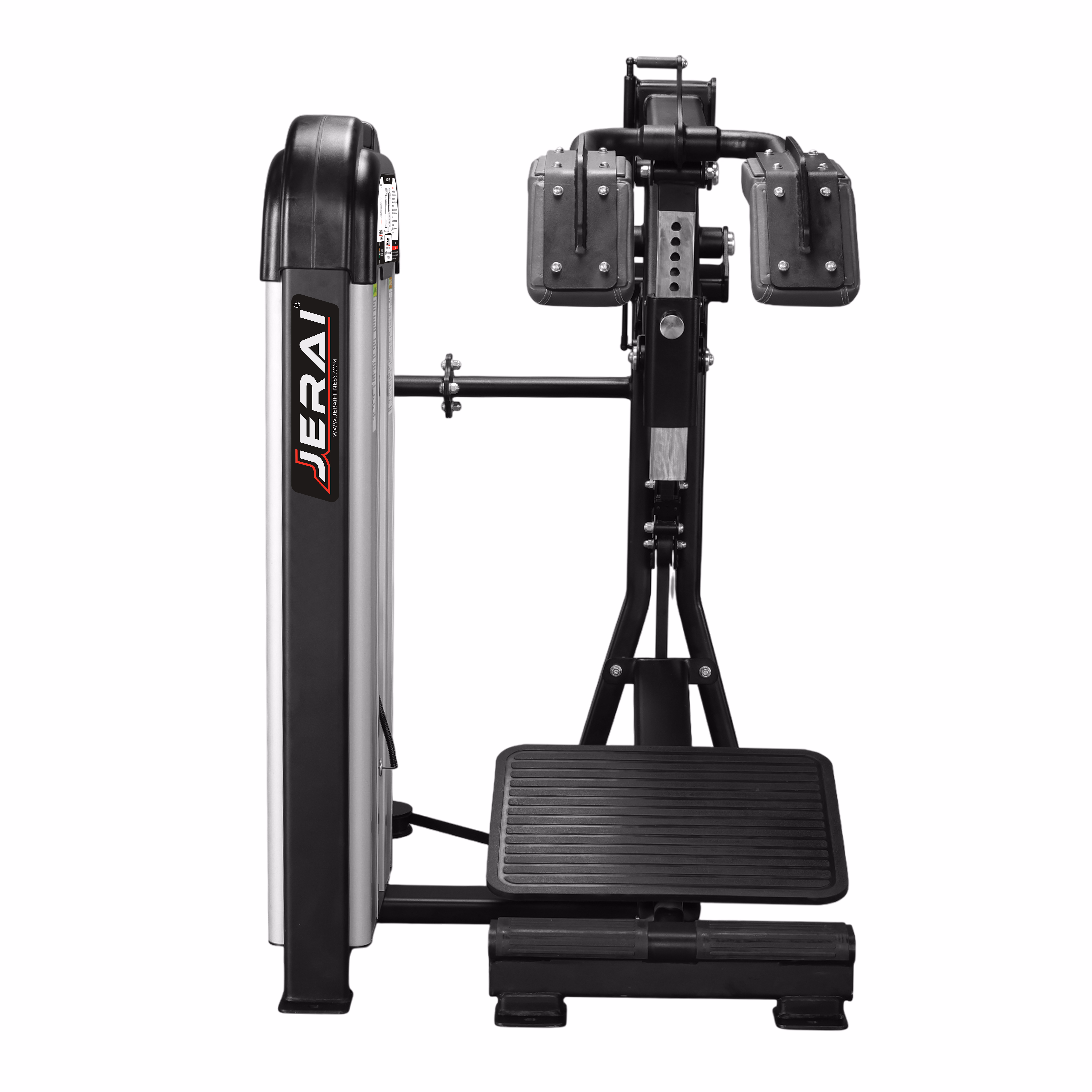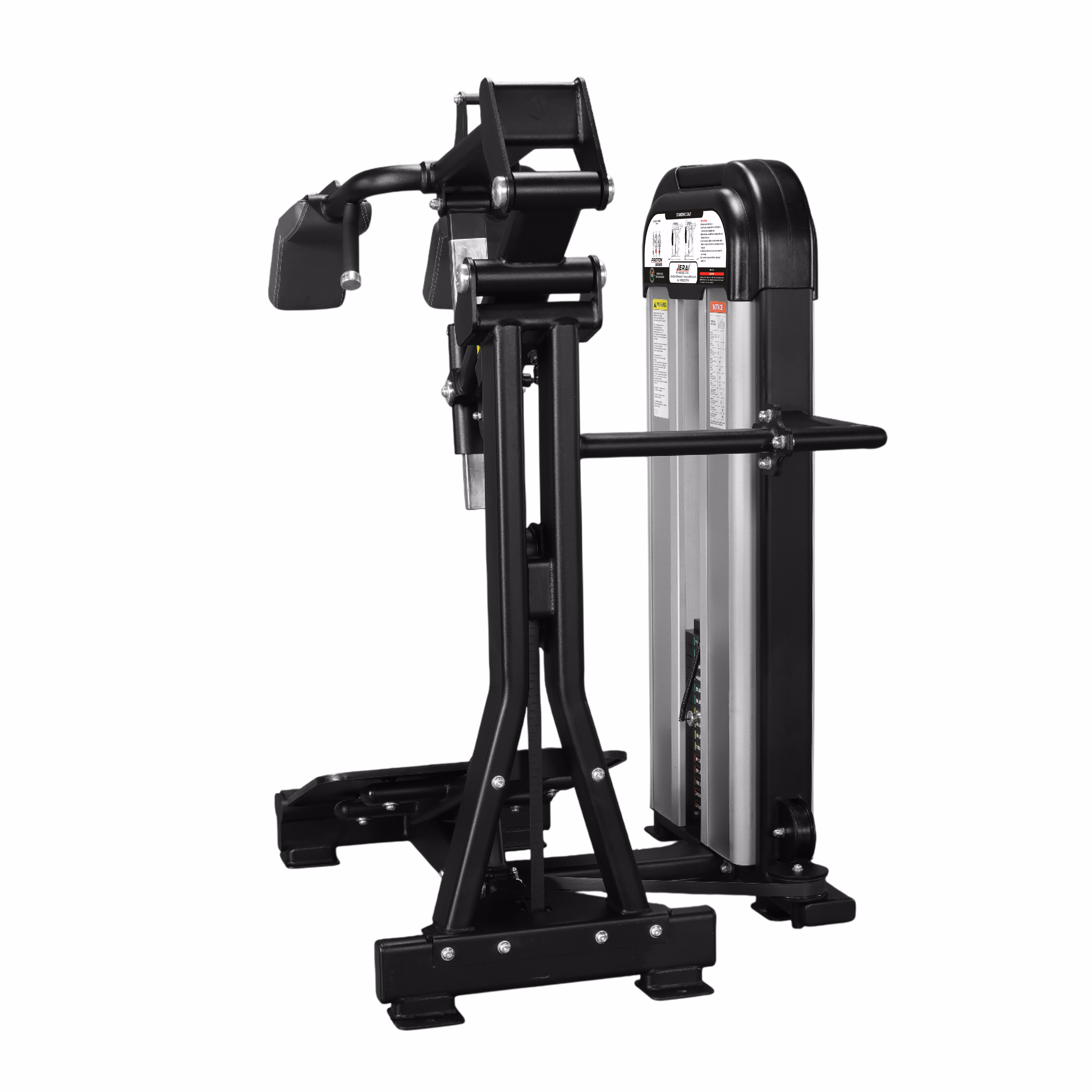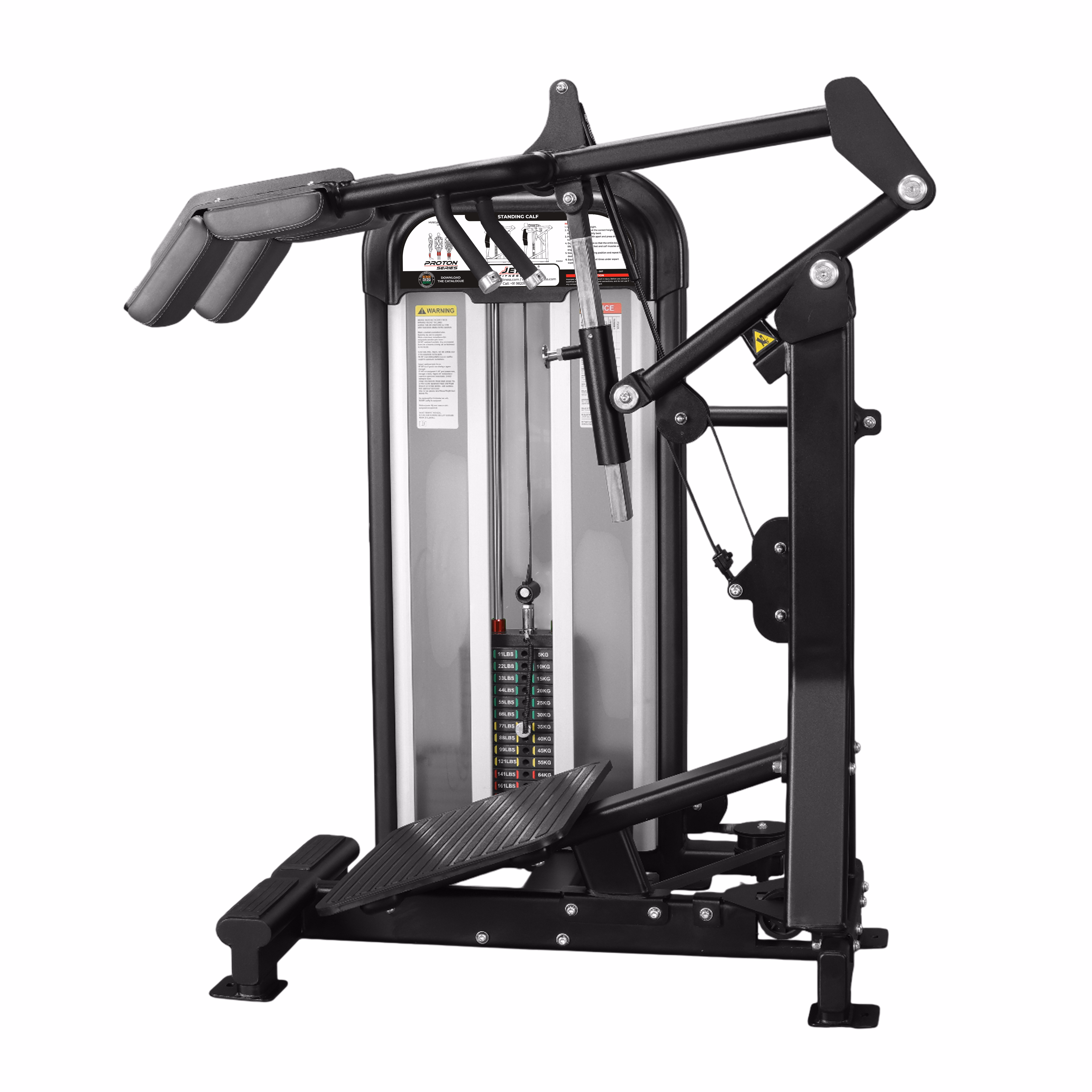 The Standing Calf from the proton Series is engineered to build calf strength with optimal resistance and stability. Engineered for targeted lower leg development, the Standing Calf machine focuses on strengthening the gastrocnemius muscles with optimal load resistance. The angled shoulder pads and textured foot platform ensure stability and proper body alignment during calf raises. With a smooth selectorized weight stack and ergonomic grip handles, it delivers consistent resistance and user control. Built for durability and performance, this machine is ideal for serious leg training in any commercial gym setting.