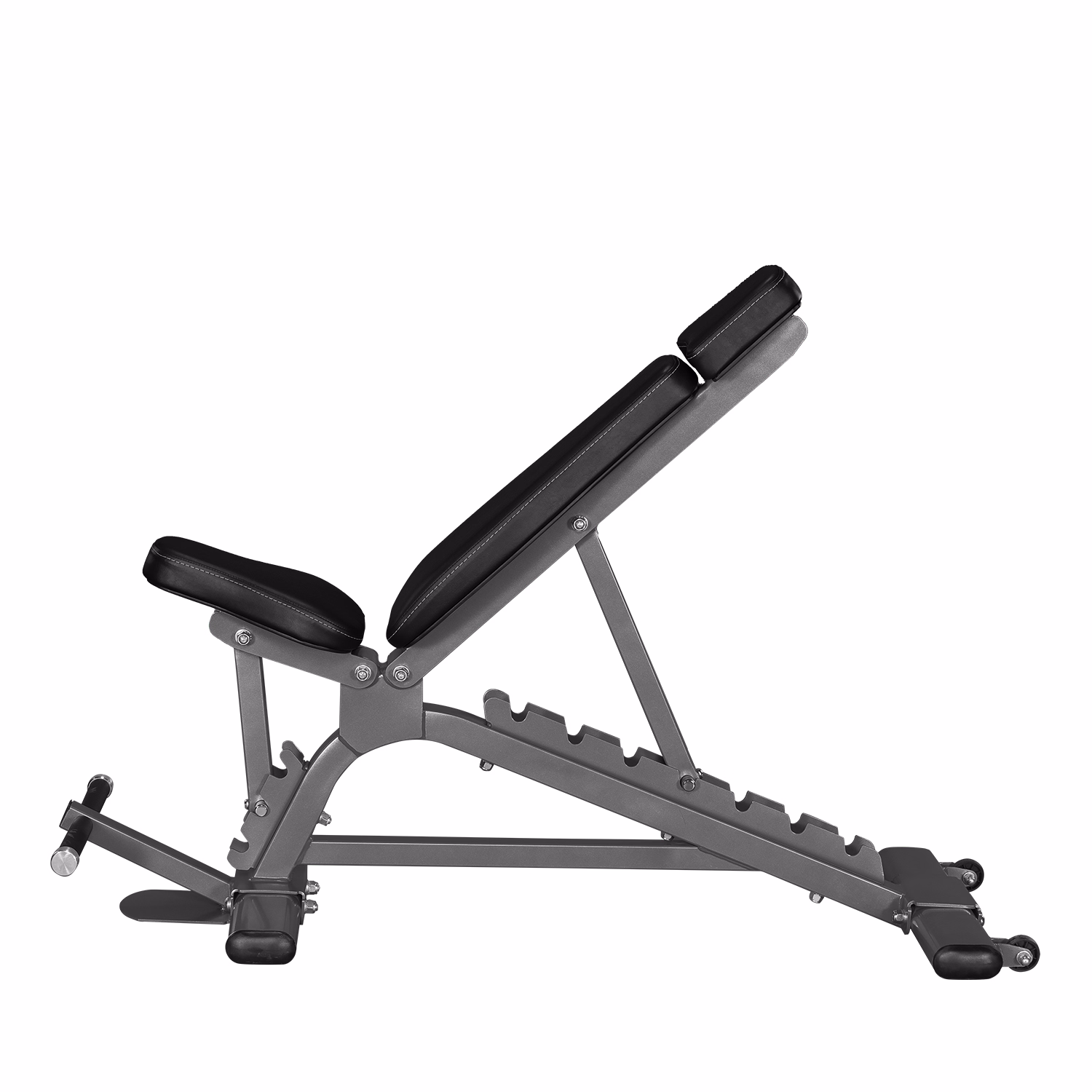 Three adjustments from horizontal up to nearly 90 degrees & down. Seat adjusts to various positions. Ideal bench for Smith, Cable Cross Over, Dumbbell Fly / Press, Row etc. The nylon wheels provided for trouble free travel.
