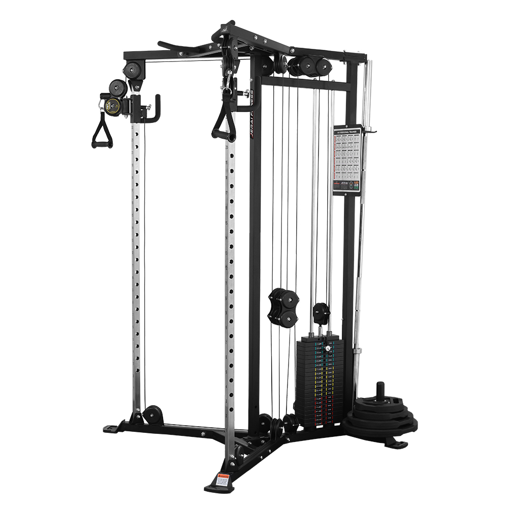 A dual weight stack cable machine that incorporates a smith machine in a compact frame to offer a well rounded workout experience. The front rail has scope for multiple attachments for various functional & compound movement excercises.